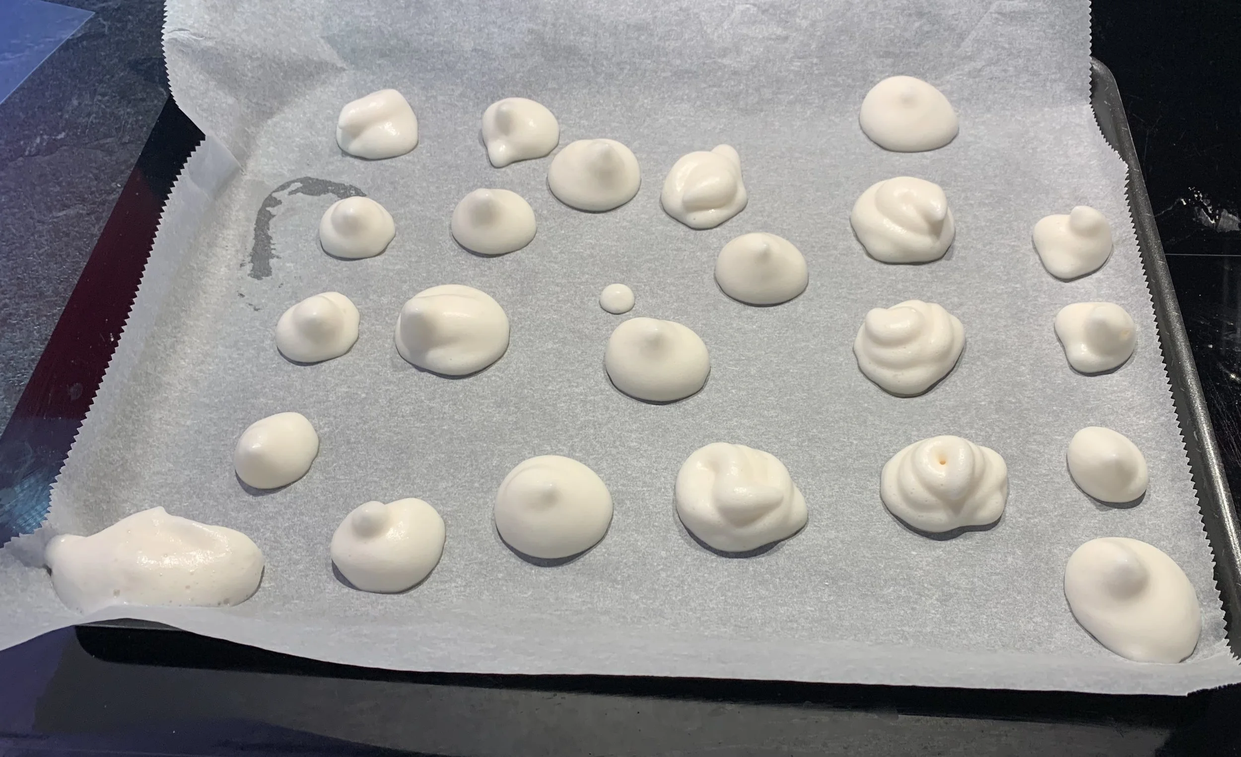 La meringue est au jus de pamplemousse et a un goût très original que j’ai beaucoup aimé. Pour que ce petit tour de magie marche il va vous falloir de la gomme xanthane (ca vaut le coup d’en commander puisque c’est une des “poudres” la plus utilisée en cuisine de haut niveau) et du blanc d’oeufs séché. Vous allez devoir battre votre meringue un bon moment pour qu’elle prenne une consistance correcte, n’abandonnez pas :) Le mélange reste assez liquide et comme vous le voyez au look de mes meringues du dessous ce n’était pas magnifique.