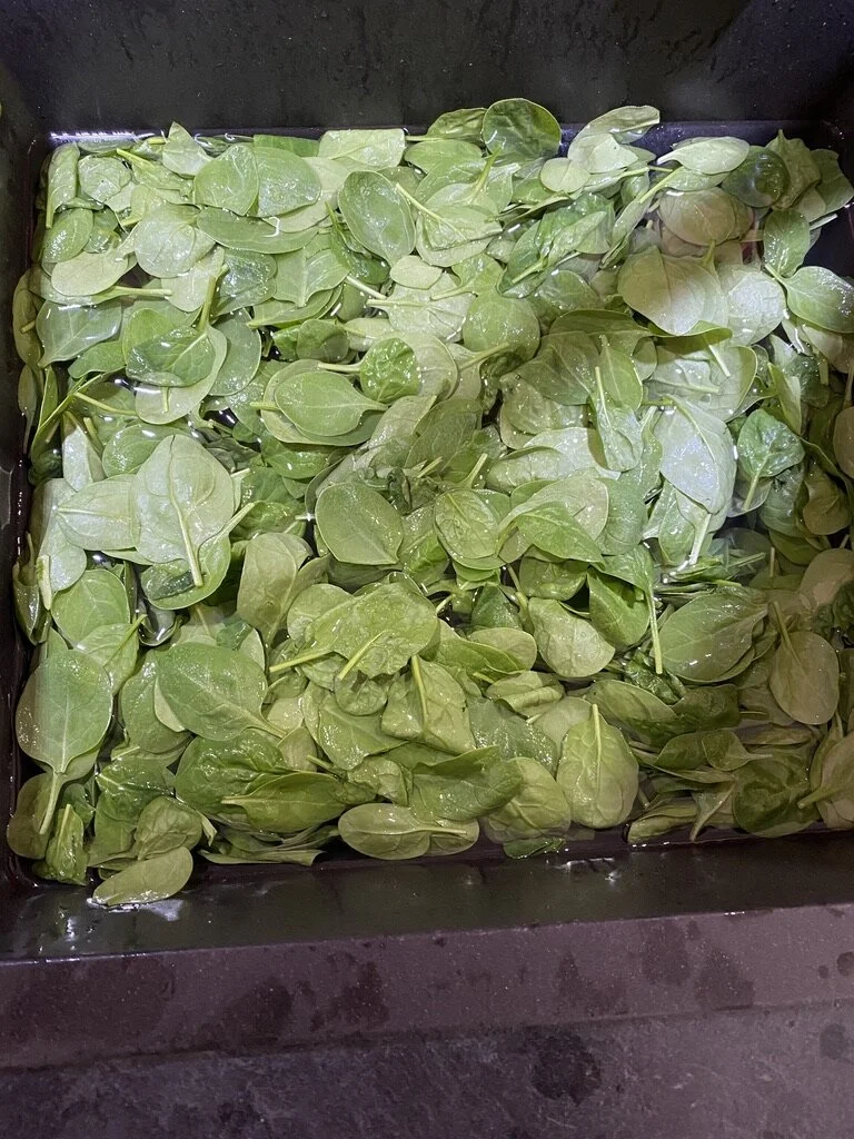 J’ai acheté 800g de pousses d’épinard au lieu de 300g pour faire un test. J’ai équeuté la moitié et j’ai laissé les queues sur l’autre moitié. -> résultats en dessous.
