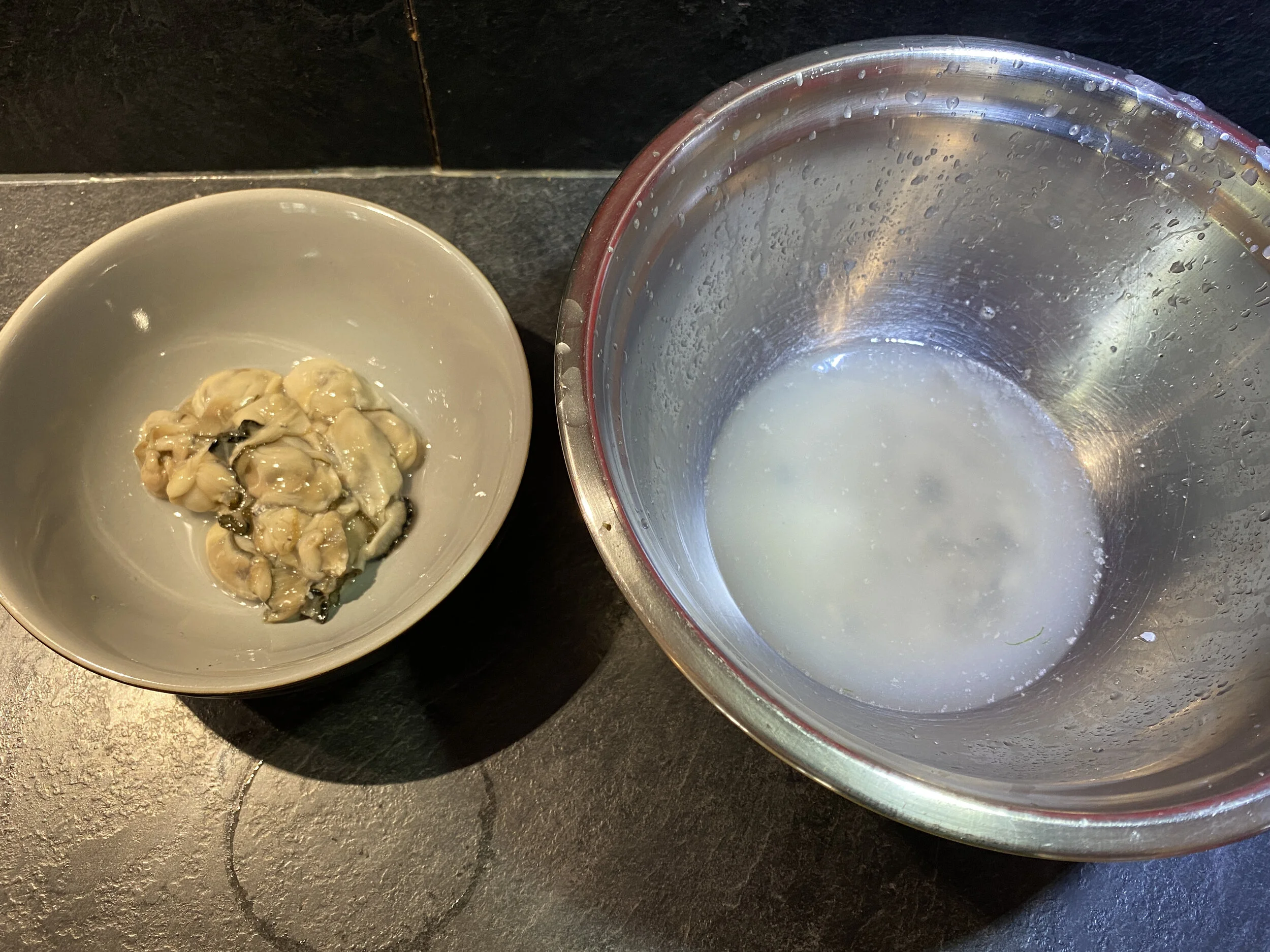 On ouvre les huîtres, on garde l’eau d’un côté et la chair de l’autre.
