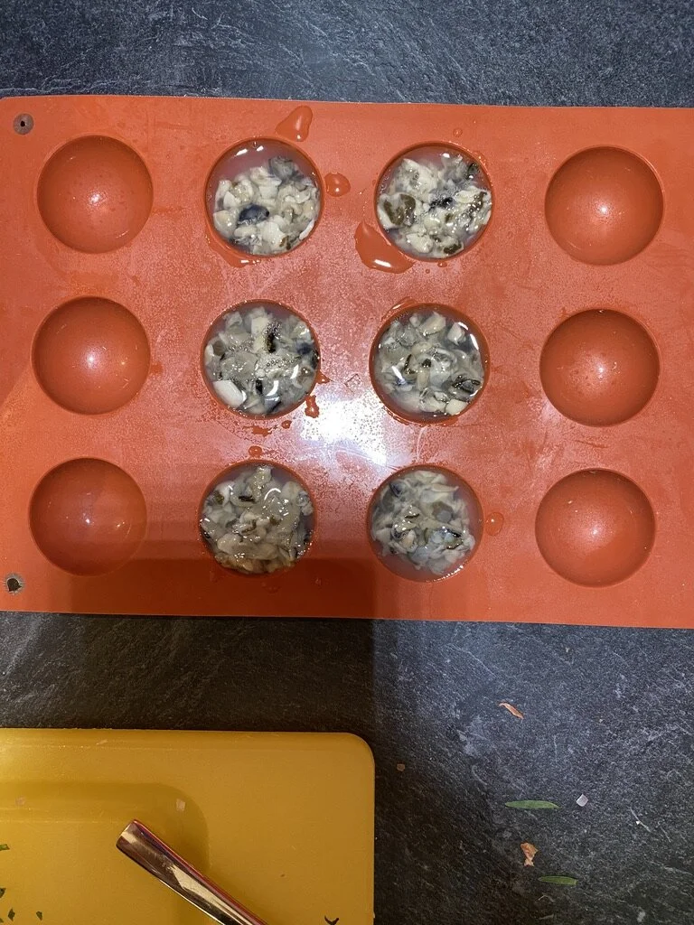 On fait des demi-sphères avec la chair + l’eau des huîtres et on refroidit.