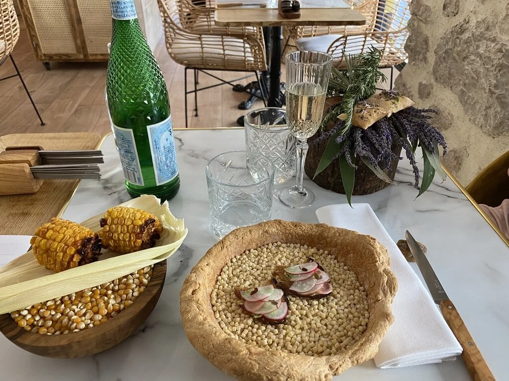 3 amuse-bouches. Le 1er était une tartine rose radis pas mauvais mais pas excellent, le 2ème un maïs qui a vraiment le goût du maïs qu’on prépare à la maison. Seul le 3ème (craquers rempli de mousse au chèvre avec de la lavande et du miel) était vraiment bon. Les amuse-bouches sont un exercice particulier et ca n’annonce pas forcément la suite du repas mais c’est rare d’en avoir qu’un sur 3 de très bon. On a donc continué le repas en ayant un peu peur !