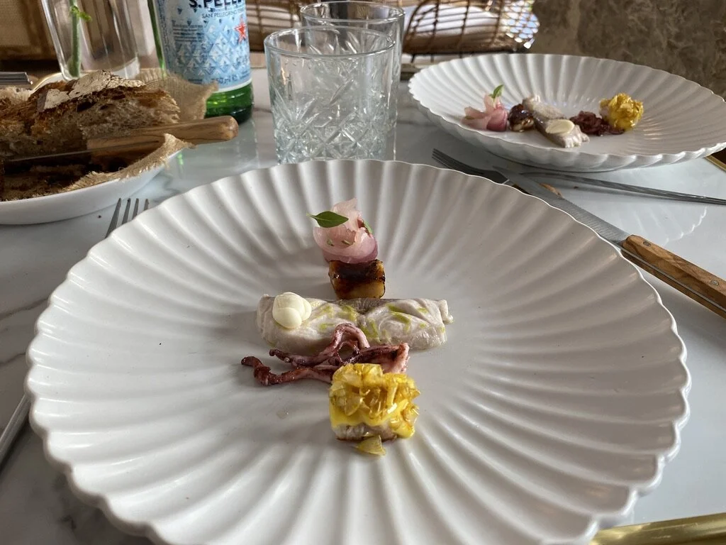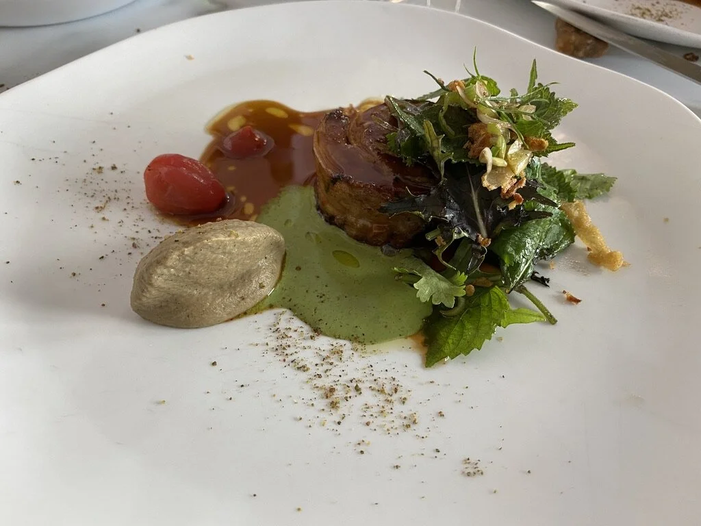 Mes craintes se sont dissipées au moment du premier plat. La tomate était délicieuse. La tuile au milieu dans la feuille de figuier contenait vraiment toutes les saveurs d’une salade de tomate. Le pain feuilleté était parfait pour tout saucer.