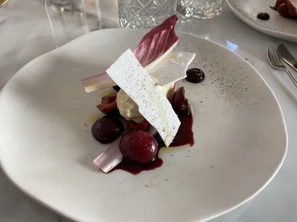 A l’ombre d’un cerisier. Compotée de cerises, glace laurier, carmines & meringues craquantes.