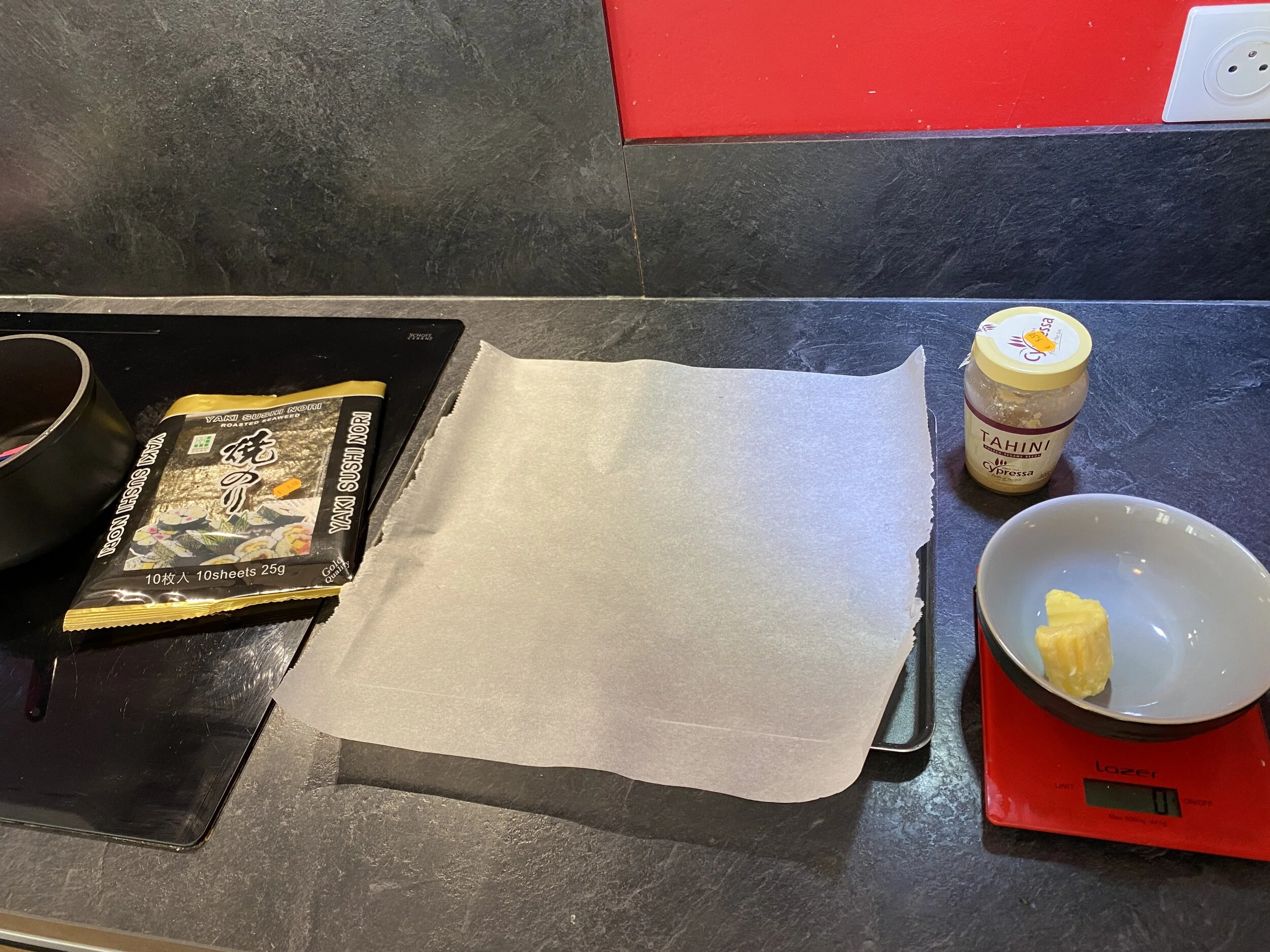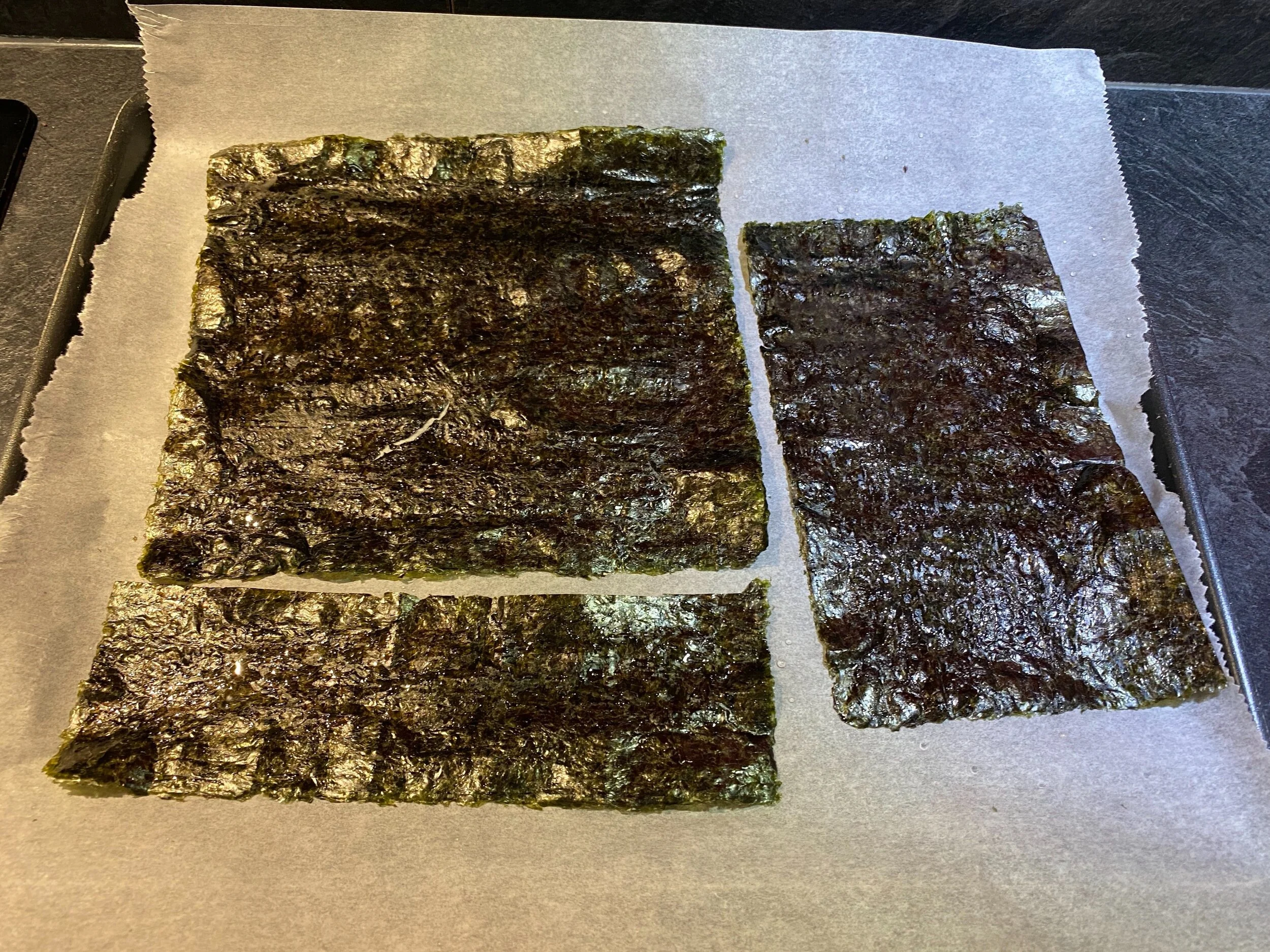 Enfournez le nori à 120°C pendant 20 minutes (retournez les feuilles à mi-cuisson). Puis ensuite 2 minutes à 180°C.
